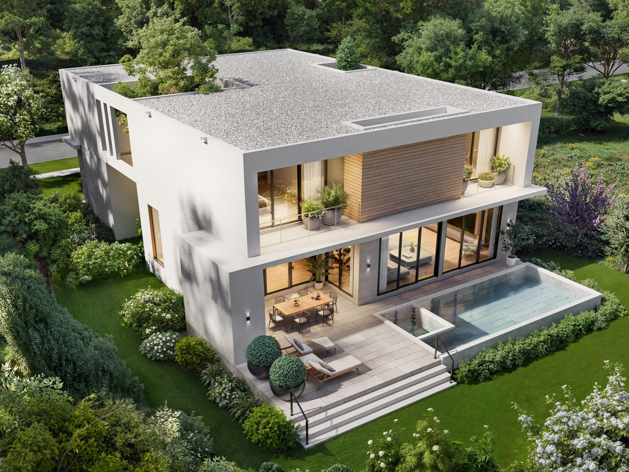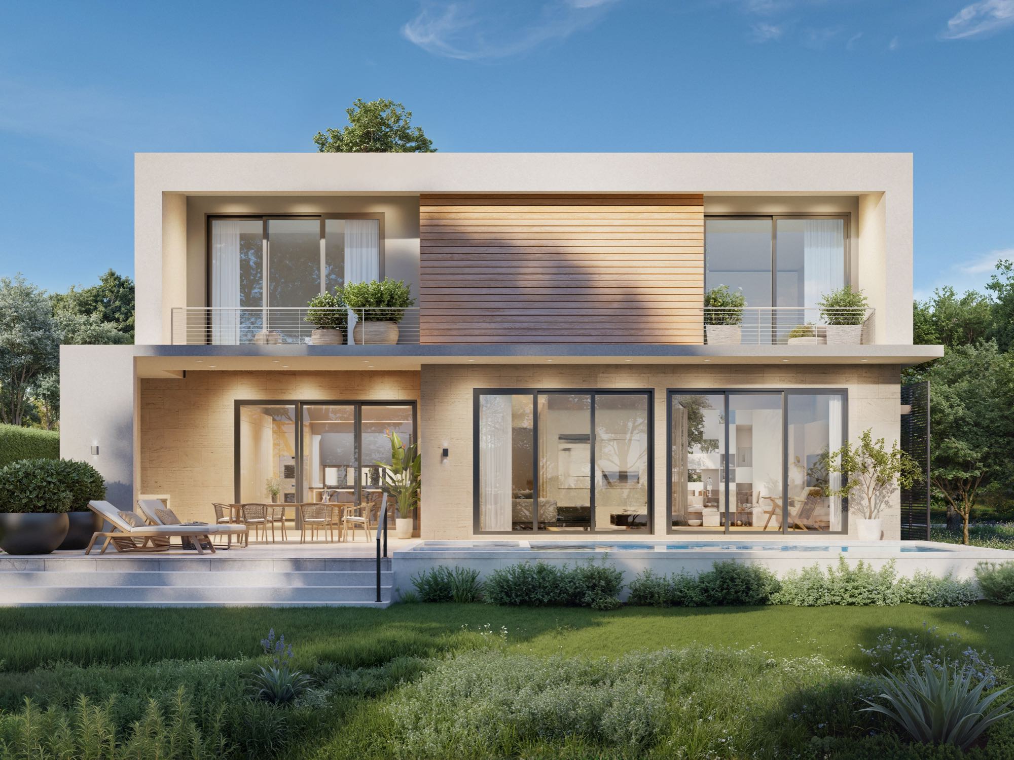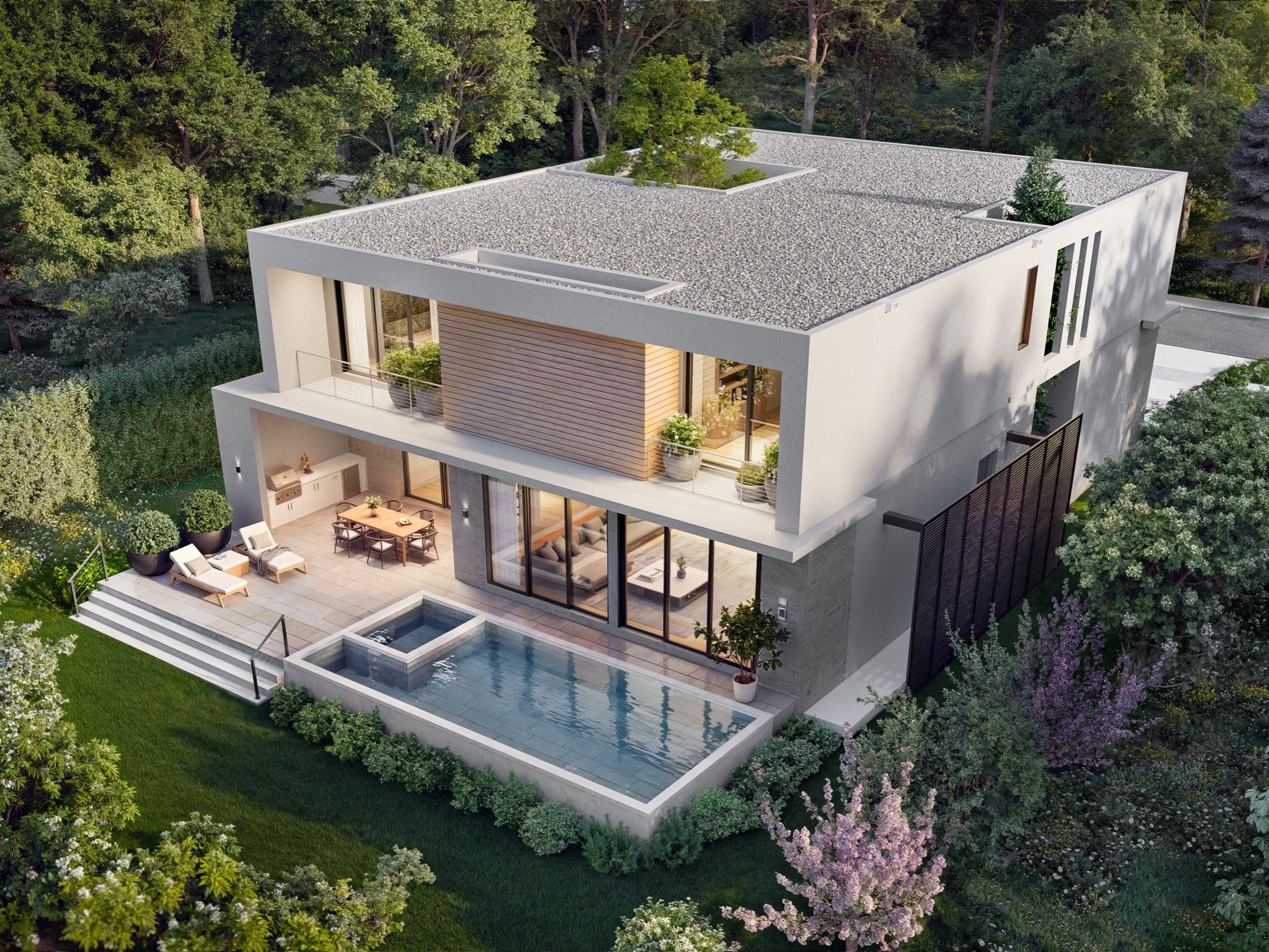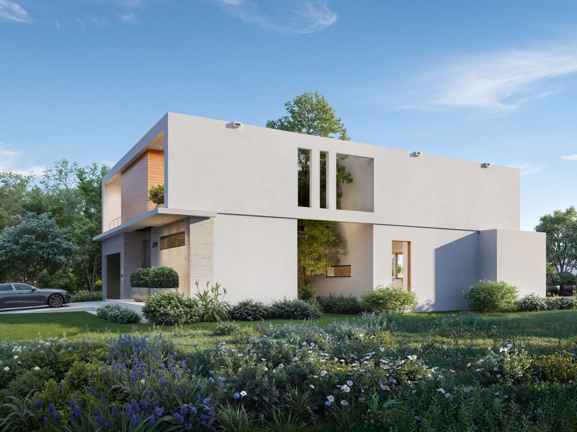 Architecturally refined single-family residence, with completion scheduled for January 2026. Offering 4,300 SF of interior space this thoughtfully designed home features 4 bedrooms, 5 bathrooms plus a powder room, and a 2-car garage. First floor has an additional Felx-room plumbing ready to converting into a full fifth bedroom with en suite bathroom. The residence welcomes you with a refined arrival experience framed by leather-finished travertine walls, and clean modern lines throughout. Designed for seamless indoor-outdoor living, the open layout flows to a summer kitchen, internal garden, pool, and a travertine-finished outdoor entertaining area. The primary suite is a true retreat, featuring a spa-inspired bathroom with teak flooring in the shower and views to a custom-designed private vertical garden wall, curated with plant selections specifically chosen for this space. High-end finishes throughout, with thoughtfully integrated systems and plenty of storage spaces.
